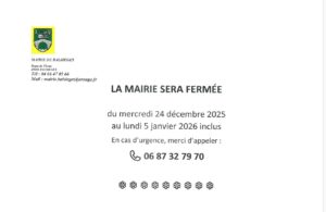 Fermeture Mairie Accueil / Actualités / Fermeture pour congés du mercredi 24 décembre 2025 au lundi 5 janvier 2026 inclus. Bonnes fêtes de fin d’année.
